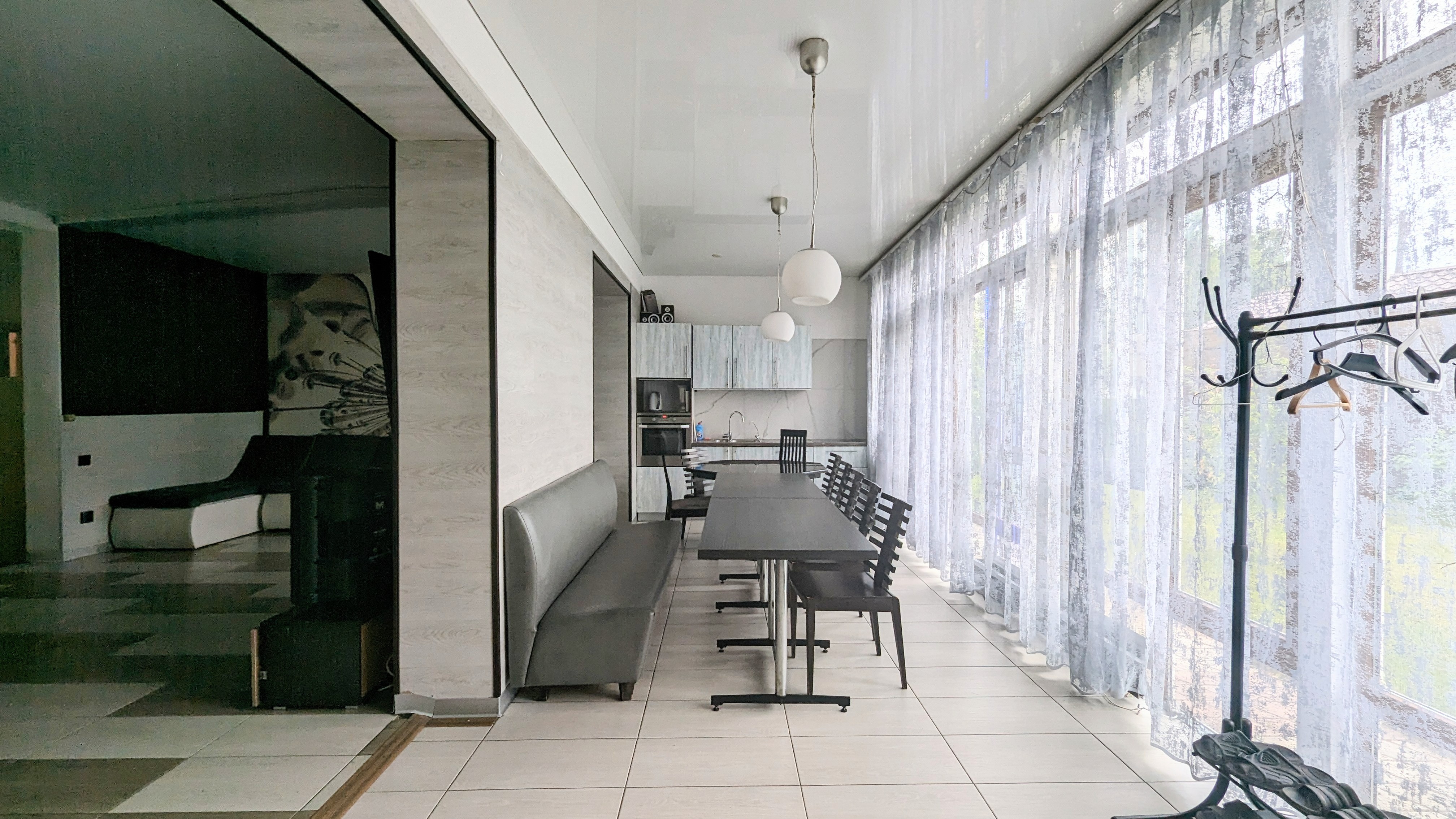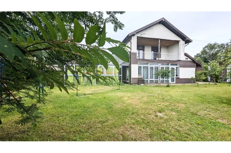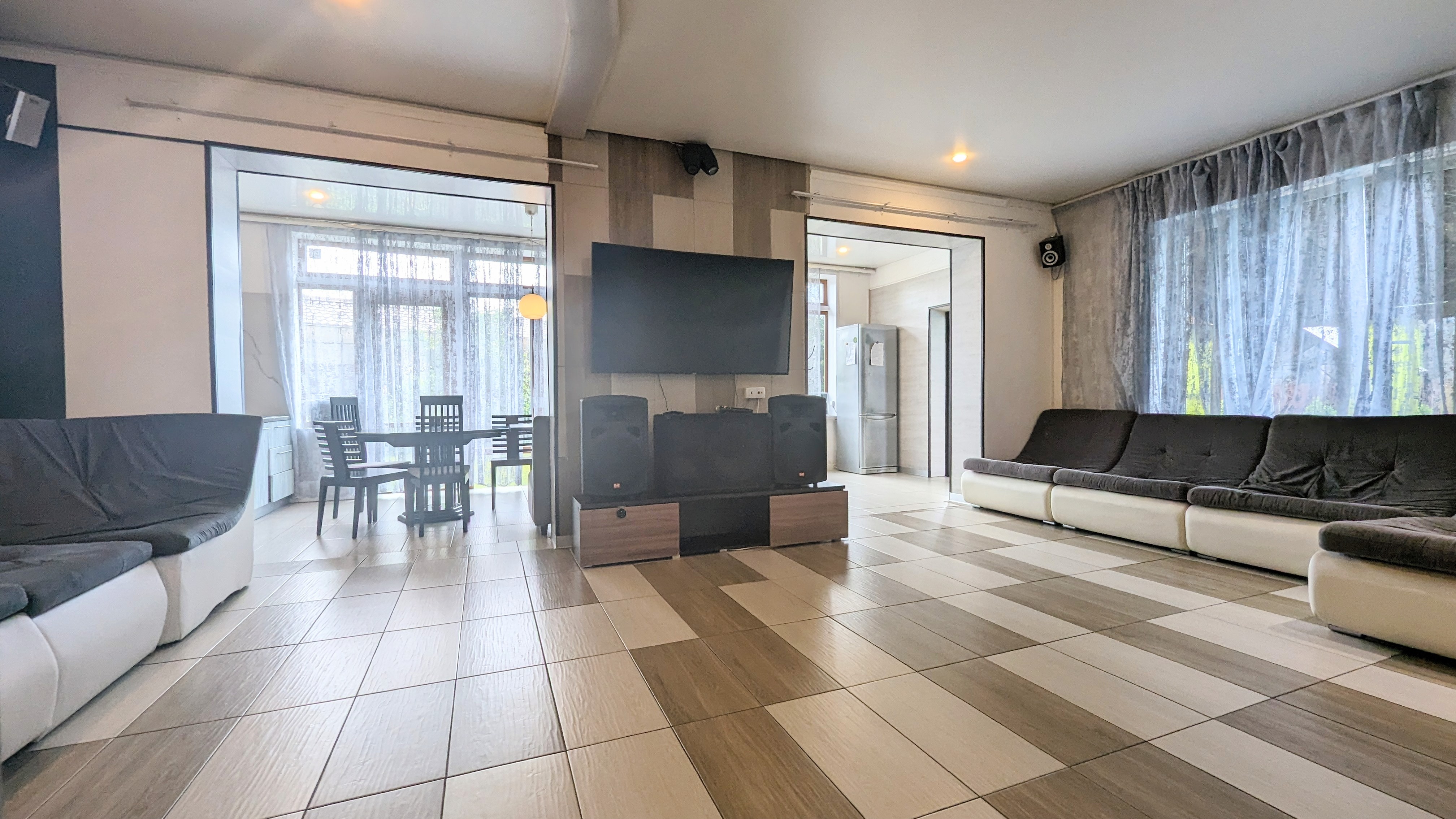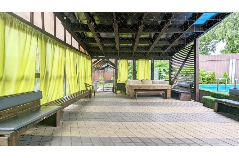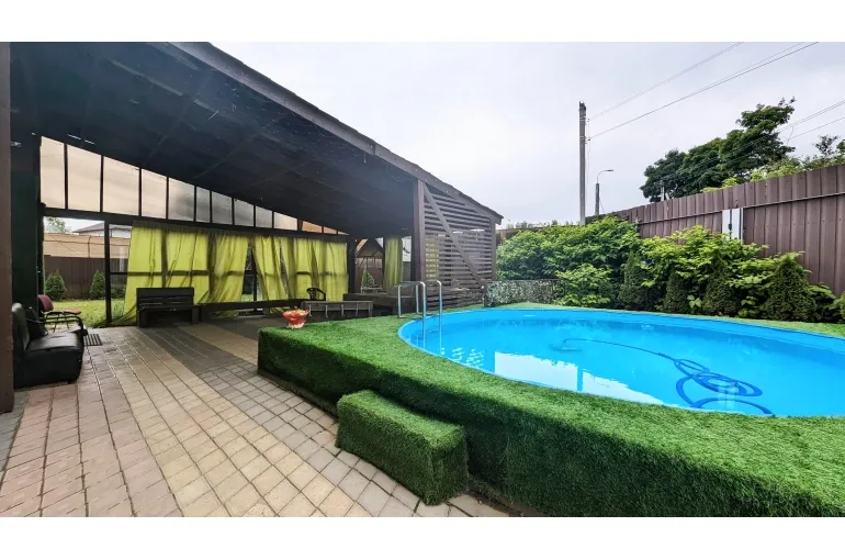 Коттедж, дом с большим бассейном .(ДОМ - КАРАОКЕ для вечеринок и диско с уютной большой верандой навесом. Профессиональная сценическая акустика, светомузыка идеально для корпоративов, дней рождения и выездных свадеб и просто для спокойного семейного отдыха. архитектурный свет и ландшафт территории, большая парковка, : на первом этаже большая гостиная объединенная с кухней-столовой. Отдельная спальня. Также санузел, и гардеробная.