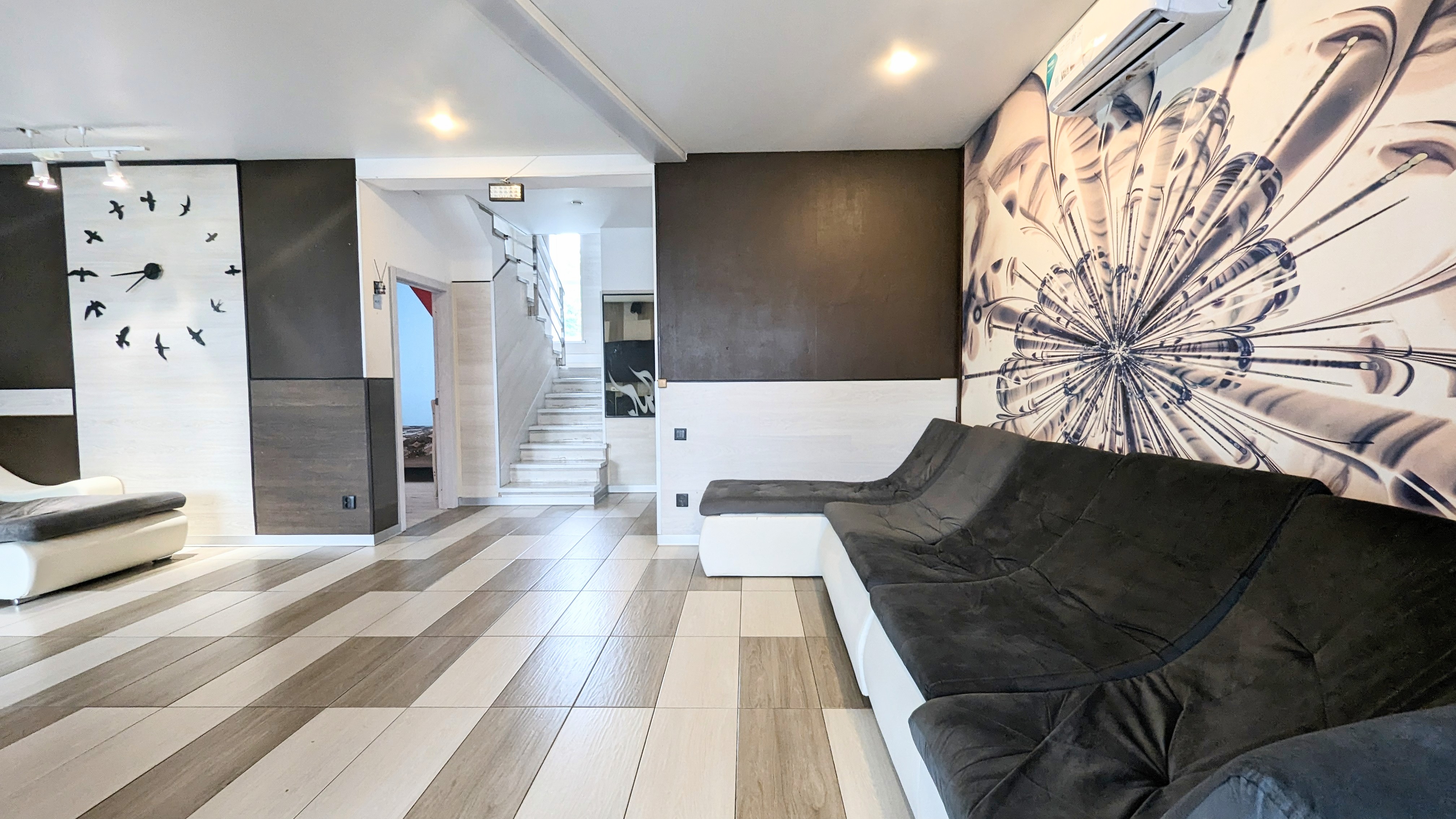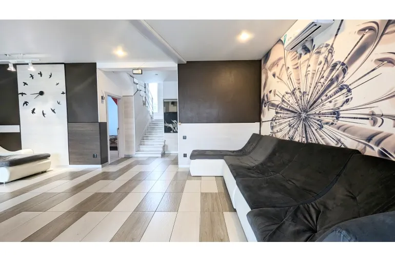 На втором этаже большой санузел с джакузи и 3 просторные жилые комнаты. С двуспальными кроватями и кресло кроватями. Детская кроватка, стульчик для кормления, детская игровая зона с игрушками. На всей территории бесшовный wi-fi. фоновая музыка на всей территории.