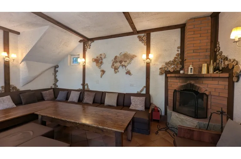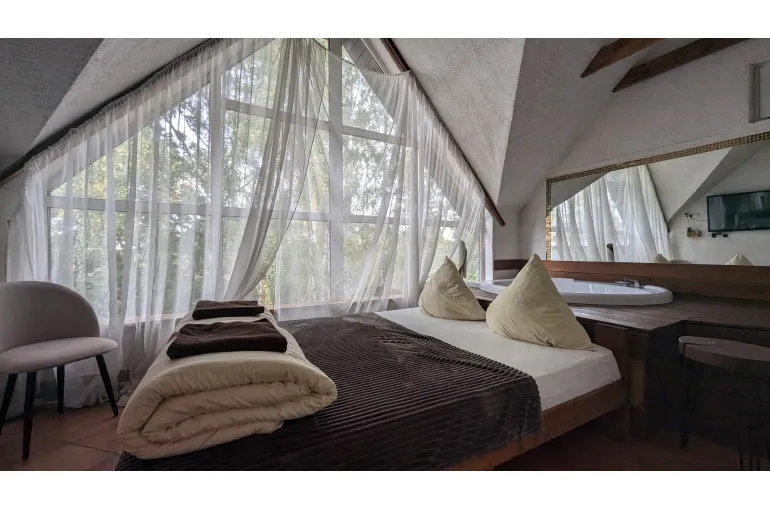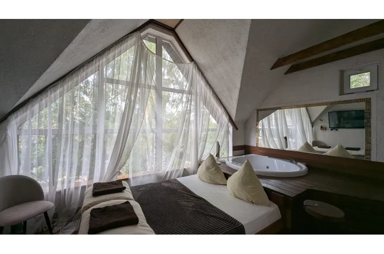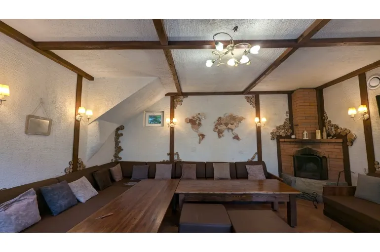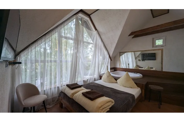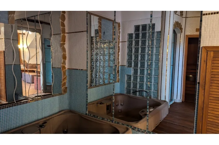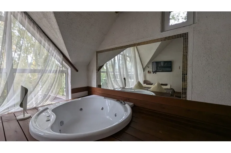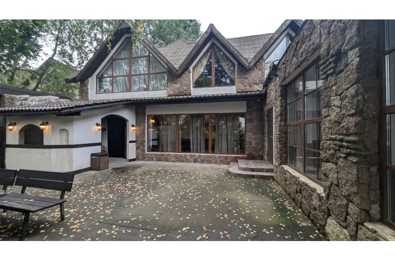 Коттедж с банным комплексом и двумя джакузи. Дом готов принять до 10 человек и расположен на территории банкетной усадьбы с рестораном. Для вашего удобства предоставляется сауна, просторная комната с камином и кухня со всем необходимым оборудованием. Панорамные окна с видом на озеро и просторная терраса с мангалом обеспечат Вам прекрасный отдых. В коттедже 3 спальни с кондиционерами и отдельными санузлами.