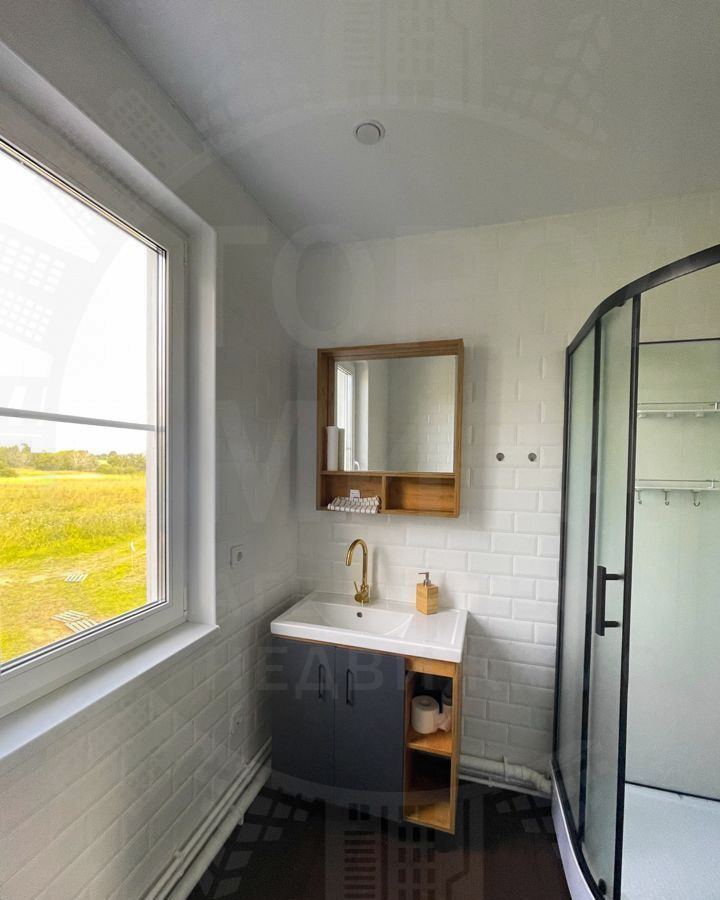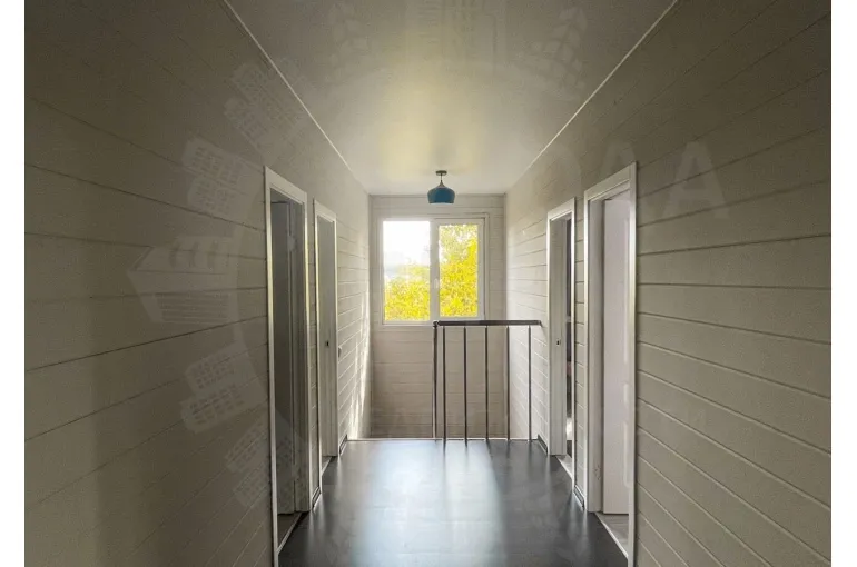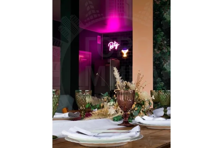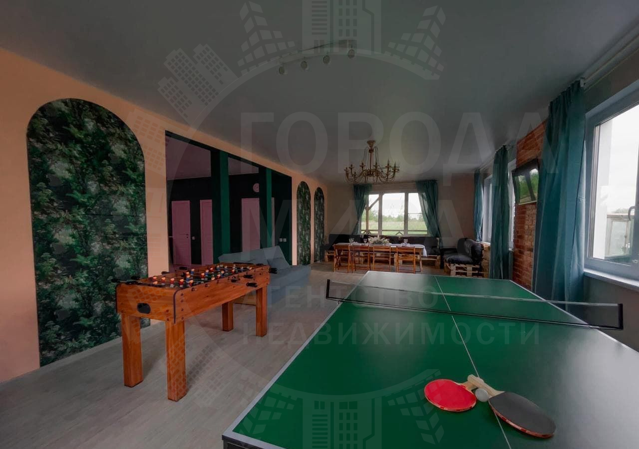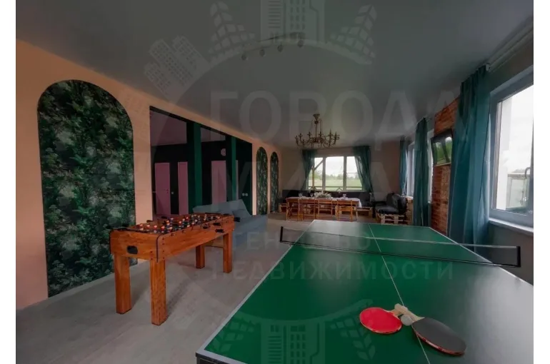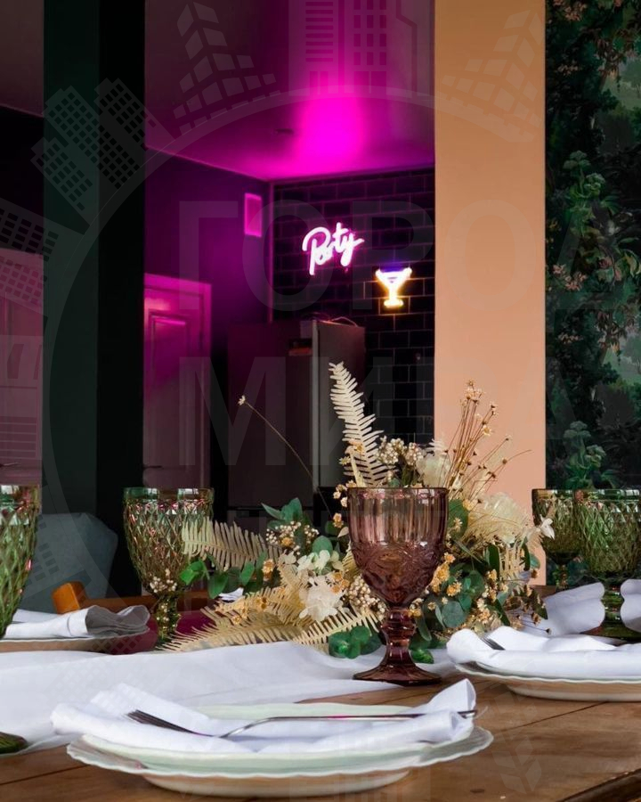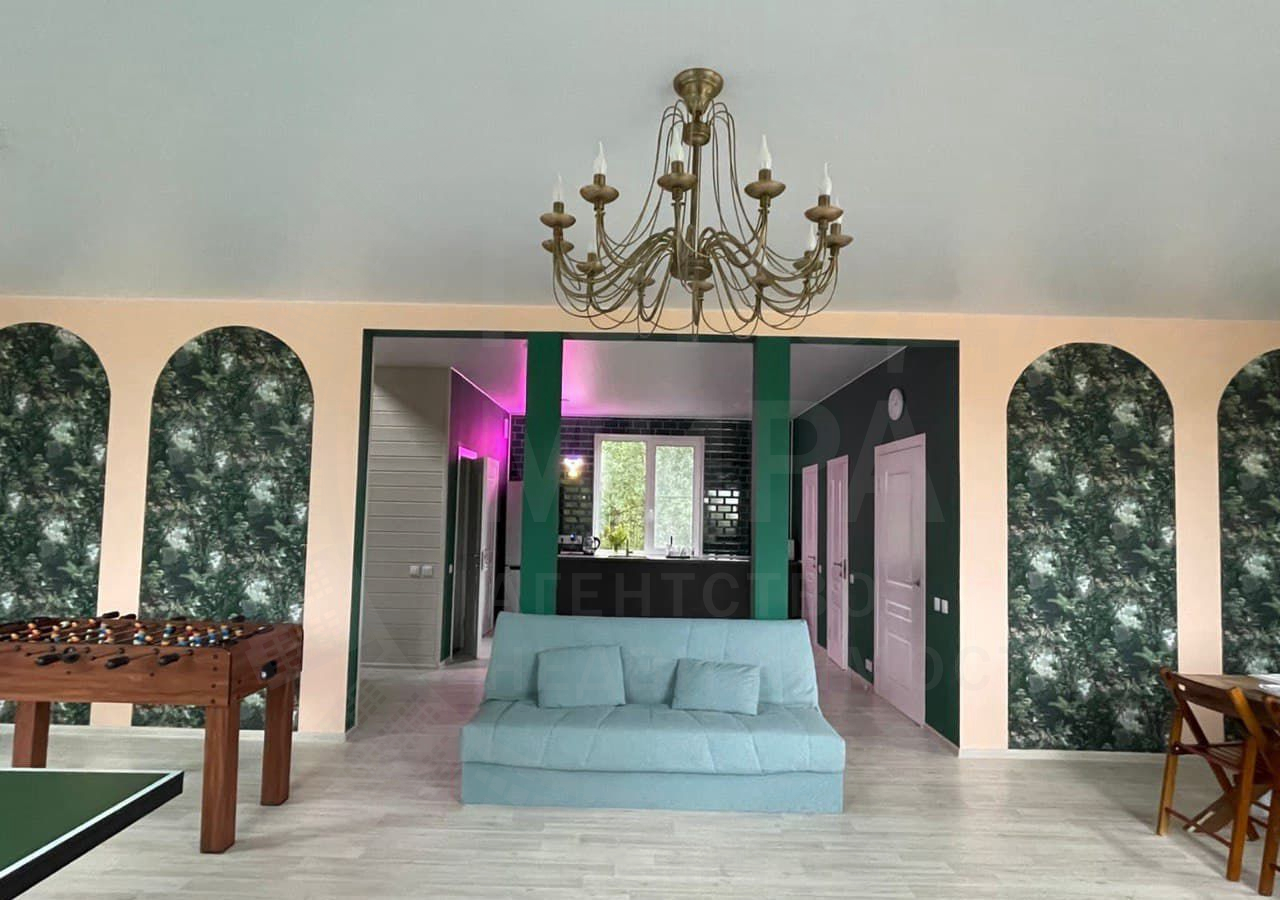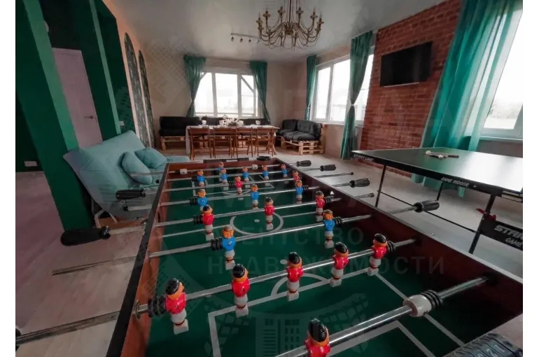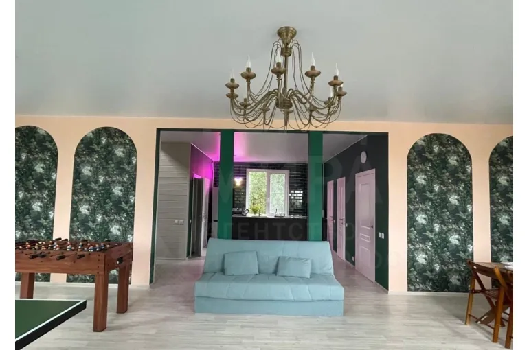 На 1м этаже находится большой зал 100м2, стильный интерьер с барной стойкой и неоновыми вывесками. На 2м этаже находится 6 спален. В доме расположены 3 ванные комнаты.