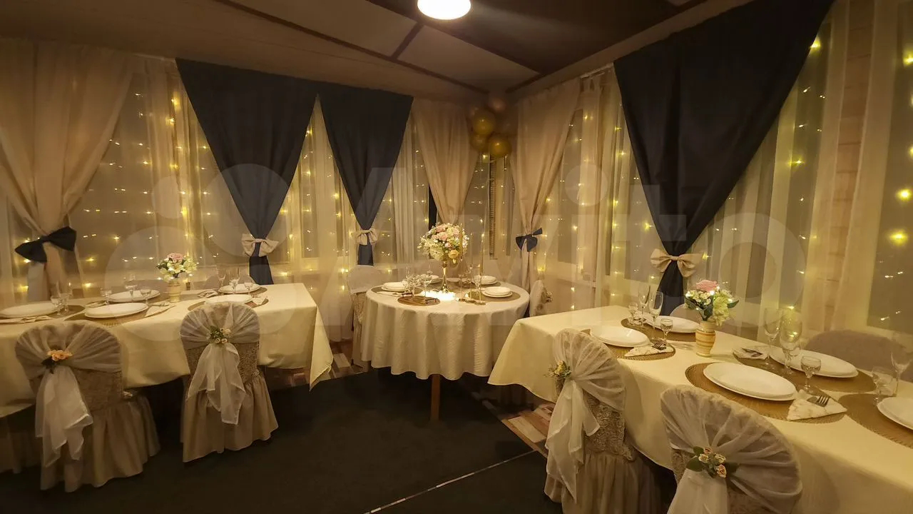 — в банкетном зале один большой круглый стол и 2 прямоугольных стола, посадочных мест 14