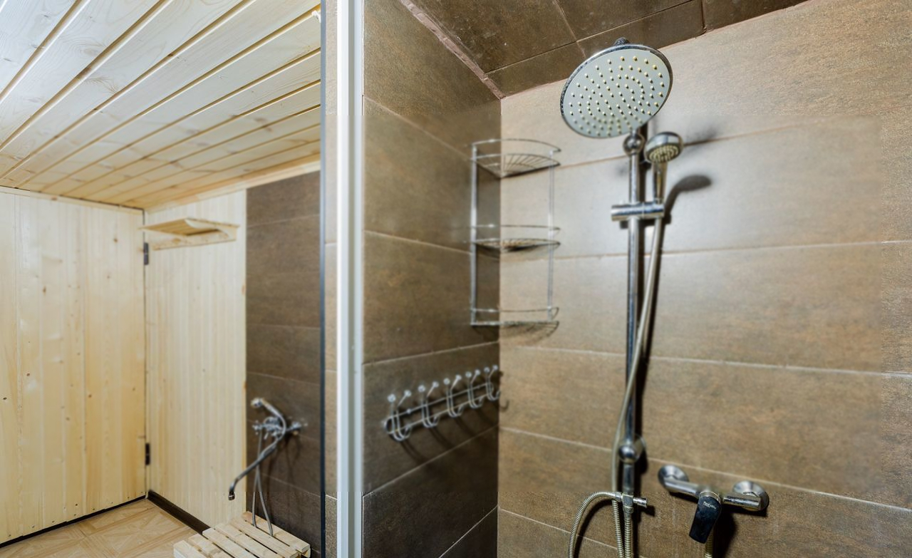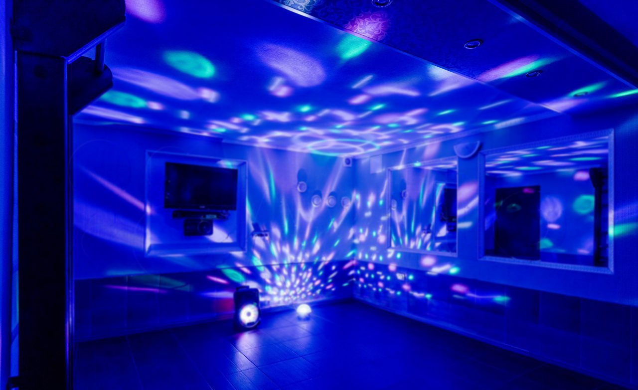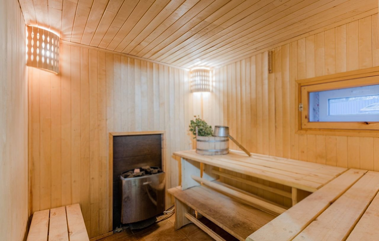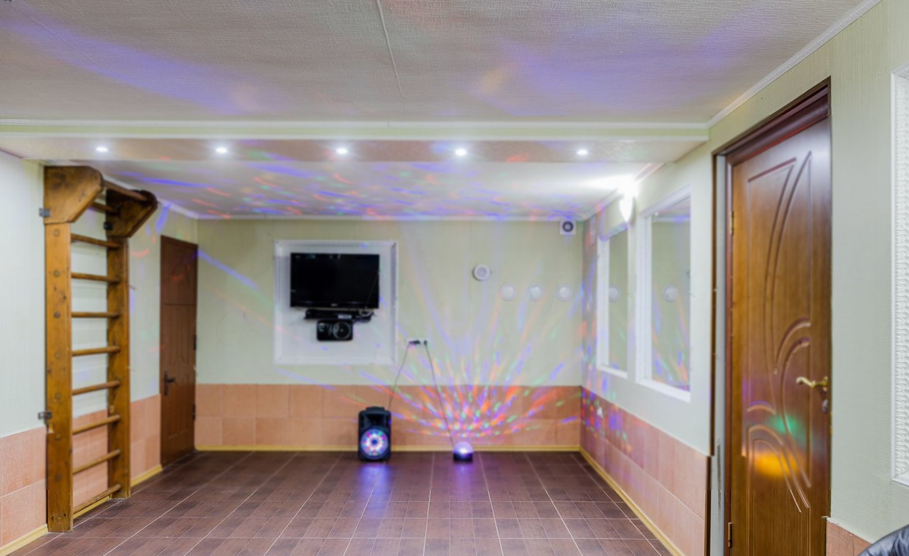 Финская сауна и зеркальный зал для отдыха и танцев (колонка, диско шар)