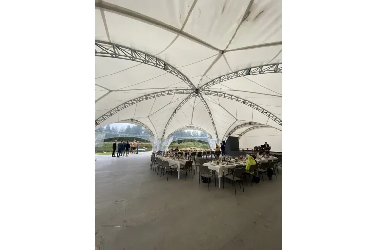 Большая терраса, обеденный стол со скамейками. Возле каждого коттеджа свой мангал с принадлежностями для барбекю.