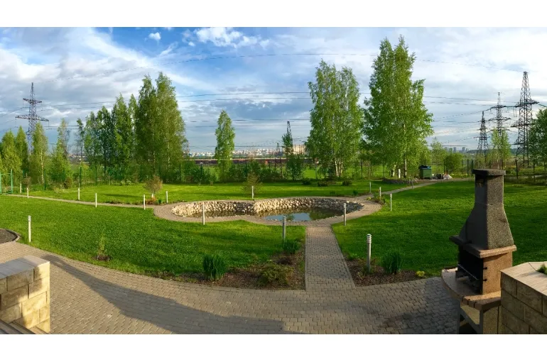 Благодаря высокому расположению, с участка размером 20 соток открывается вид на Санкт-Петербург. Участок с ландшафтом, газоном и прудом с фонтаном.